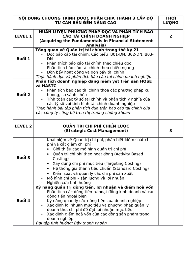 Chương trình chú trọng vào việc cung cấp những công cụ phân tích tài chính, bài tập thực hành - nghiên cứu tình huống những công ty đã niêm yết.